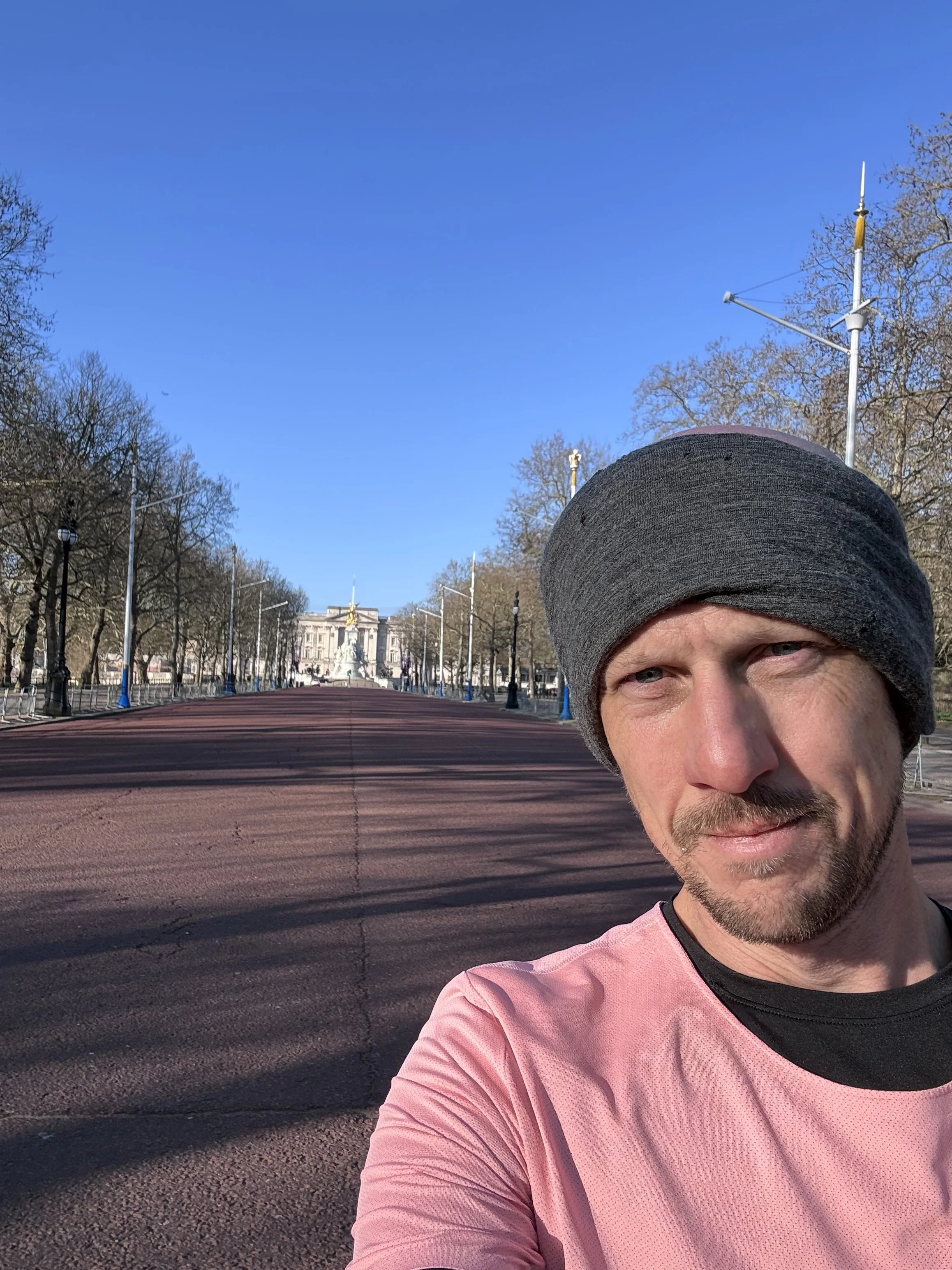 Running down the middle of the road, completely alone, with a clear line to Buckingham Palace.
