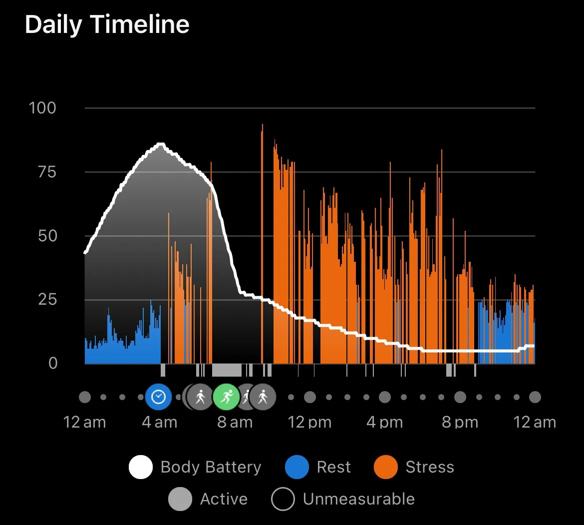 One of my most used stats from my Garmin is the body battery function. Since I have started wearing it I consistently refer to it to see how my body is recovering or where my energy levels are because it’s a good reflection of how I feel. It was quite obvious on reflection that I didn’t manage my body well prior to the last race having worked some crazy shifts for work and then having a busy day before the marathon. This time 4 days out I started to track my activity and keep an eye on how my body was feeling, no crazy night shifts.